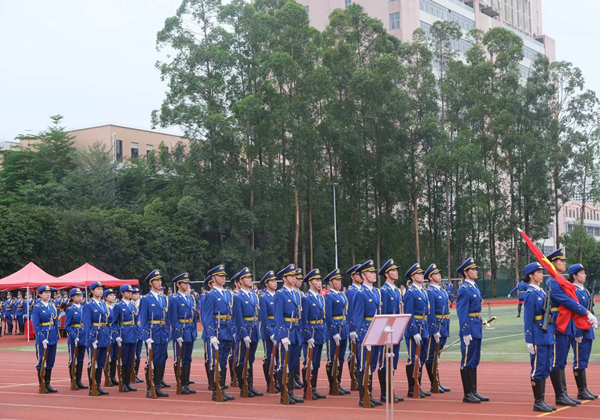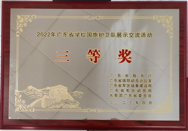 本网讯(记者 冯静怡 张馨月)4月24日,由广东省教育厅、广东省国防动员办公室、广东省军区战备建设局、广东省军区动员局、共青团广东省委员会联合举办的2022年广东省学校国旗护卫队展示交流活动决赛在五邑大学举行。经过激烈的角逐,我校国旗护卫队以标准规范的动作、昂扬的精神风貌,荣获交流展示活动三等奖。